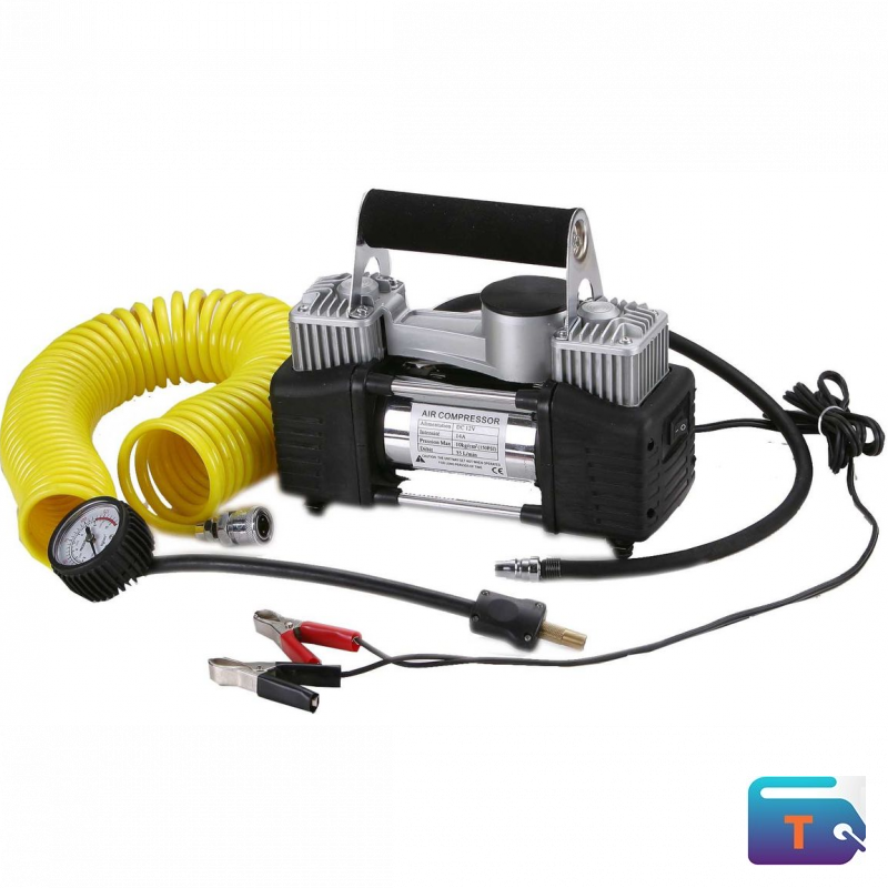 Includes coiled yellow air hose, pressure gauge, and power cables