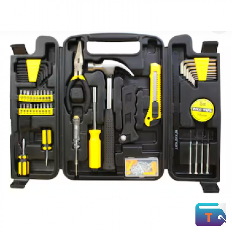 The set includes a wide variety of essential hand tools such as screwdrivers, precision bits, pliers, a claw hammer, utility knife, measuring tape, hex keys, sockets, and accessories—perfect for home repairs, automotive work, electrical tasks, furniture assembly, and general maintenance.