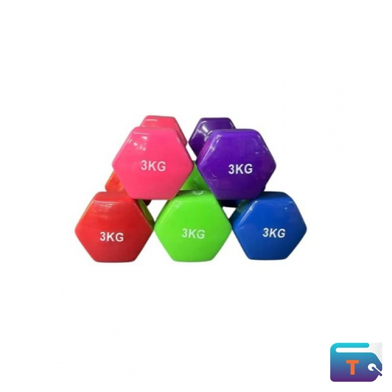 These dumbbells are made from cast iron and are coated with materials like rubber or vinyl for durability and to protect floors. The hexagonal shape prevents them from rolling when placed on the ground, which is a key safety feature. They are used for a variety of exercises, including strength training, aerobics, and full-body workouts. The dumbbells are available in various bright colors and are 3kg.
