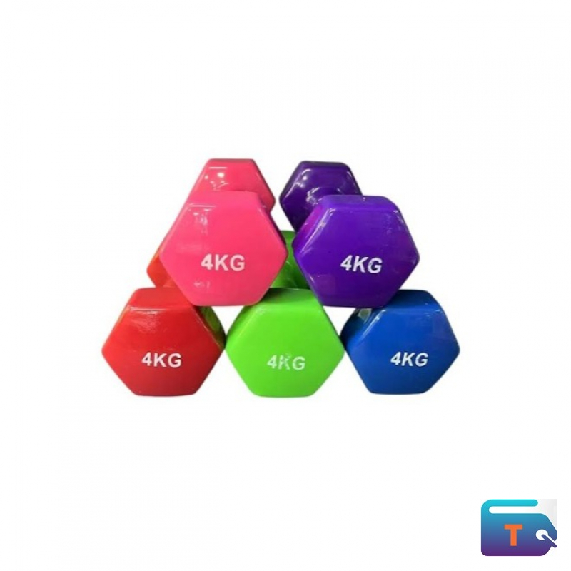 This is a set of 4kg hexagonal dumbbells. These dumbbells are fixed-weight, made of cast iron with an outer coating of vinyl or neoprene. The hexagonal shape is designed to prevent them from rolling when placed on the floor. They come in  variety colors. These types of dumbbells are used for a wide range of exercises, including strength training, circuit training, and yoga.