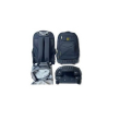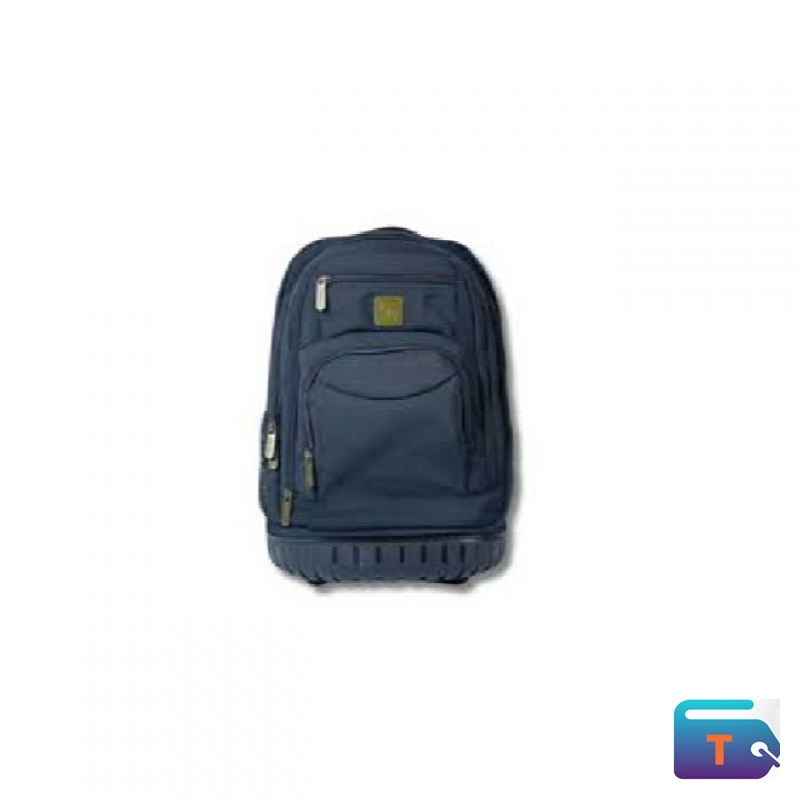 The bag is a Cotton Road Trolley Backpack designed to function as both a backpack and a rolling bag. It is black and features a sturdy hard base with wheels, as well as a retractable handle. The design includes padded, adjustable shoulder straps that can be tucked away when the bag is being wheeled.