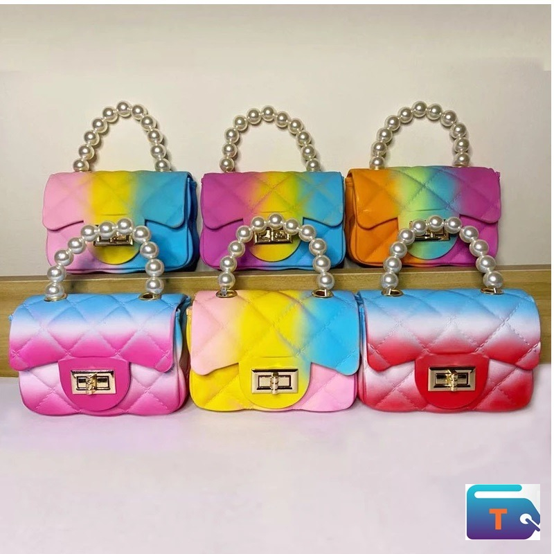 This is a quilted jelly crossbody bag with a tie-dye or rainbow color pattern. The bag is a mini size and features a gold-toned twist-lock closure on the front flap. It has two straps: a top handle made of faux pearls and a long, detachable metal chain strap, allowing it to be worn as a shoulder or crossbody bag. The material is PVC, and is durable, lightweight, waterproof, and easy to clean.