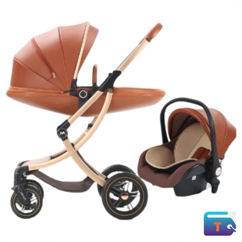 The baby stroller features a wide seat base and multi-position recline seat.