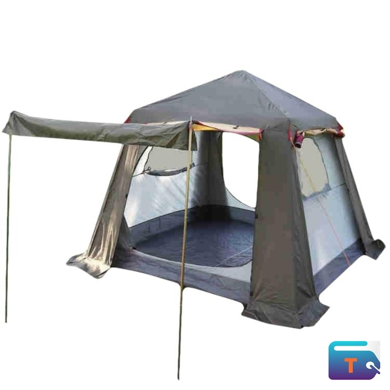 • Structure: The tent has an extended awning or canopy supported by poles, creating a shaded porch area in the front. The main body includes large windows, often with mesh screening, to offer ventilation and insect protection.