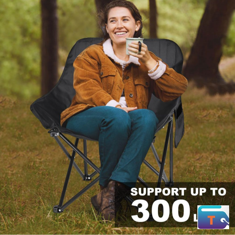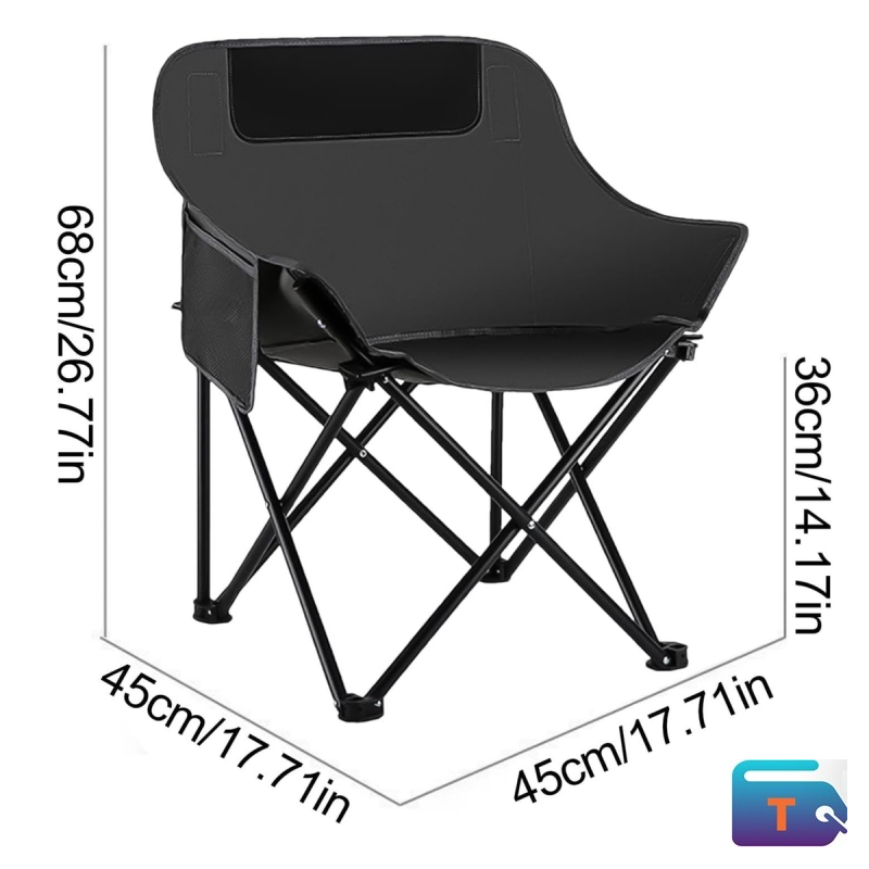 Product Overview: This high-back folding chair is built for comfort and convenience. With a durable black fabric seat, sturdy metal frame, and integrated mesh pocket, it’s perfect for camping, outdoor events, or backyard relaxation.