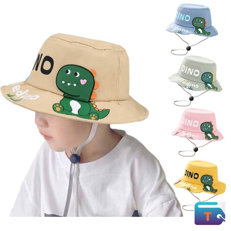 This is children's bucket hat and it comes in different colors. The hat is made of a cotton or cotton-blend material and features a cartoon dinosaur theme. It has the word "DINO" embroidered on the front and a separate cartoon dinosaur patch on the side. The hat includes a wide brim for sun protection and an adjustable chin strap with a toggle to keep it securely in place.