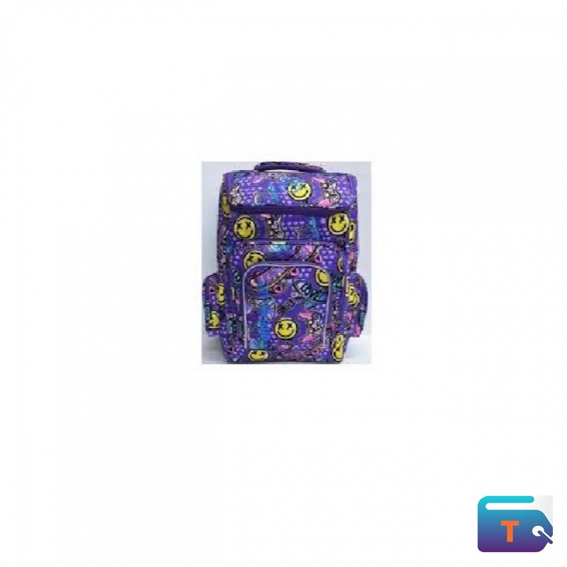This is the Cotton Road Kids Front Pocket Backpack. It is purple with a colorful cartoonish print featuring happy faces, hearts, stars, and text. The backpack has multiple compartments, including a front pocket, and adjustable, padded shoulder straps. The dimensions are 30cm x 44cm x 15cm. This bag also comes in different colors.
