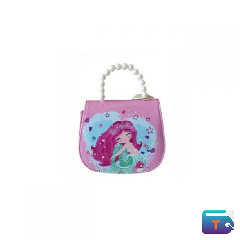 Mini Mermaid Girl's Crossbody Handbag This bag is a girl's crossbody handbag with a pink finish. One side features a mermaid print, while the other is a solid glitter pink. It has a pearl handle for use as a handbag and comes with a detachable strap, allowing it to be worn as a crossbody or shoulder bag. The bag is made from durable, waterproof PU leather. It has a magnetic flap closure to keep items secure.