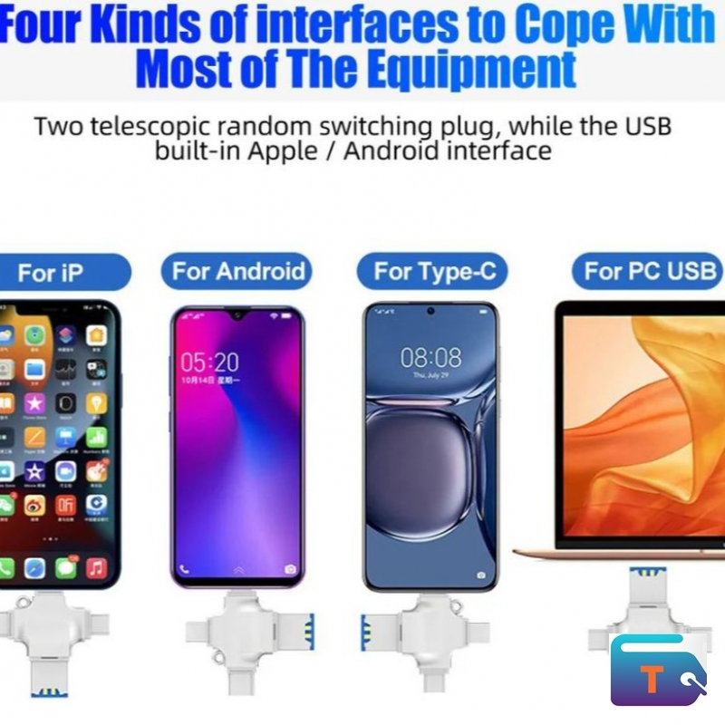 -It has four interfaces: Lightning connector for iOS devices Micro USB connector for Android devices USB connector for computers/Macs Type-C connector is for android devices