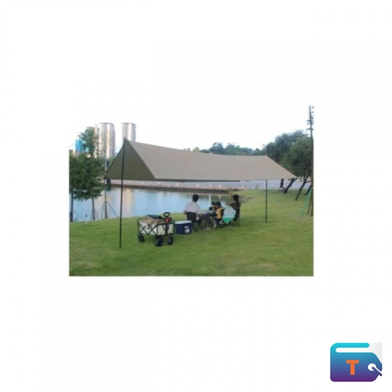 This is an outdoor camping tarp shelter or canopy, which provides shade and protection from elements like sun and rain. It is essentially a large, flat, rectangular piece of waterproof fabric supported by poles and held taut with guy lines and pegs.