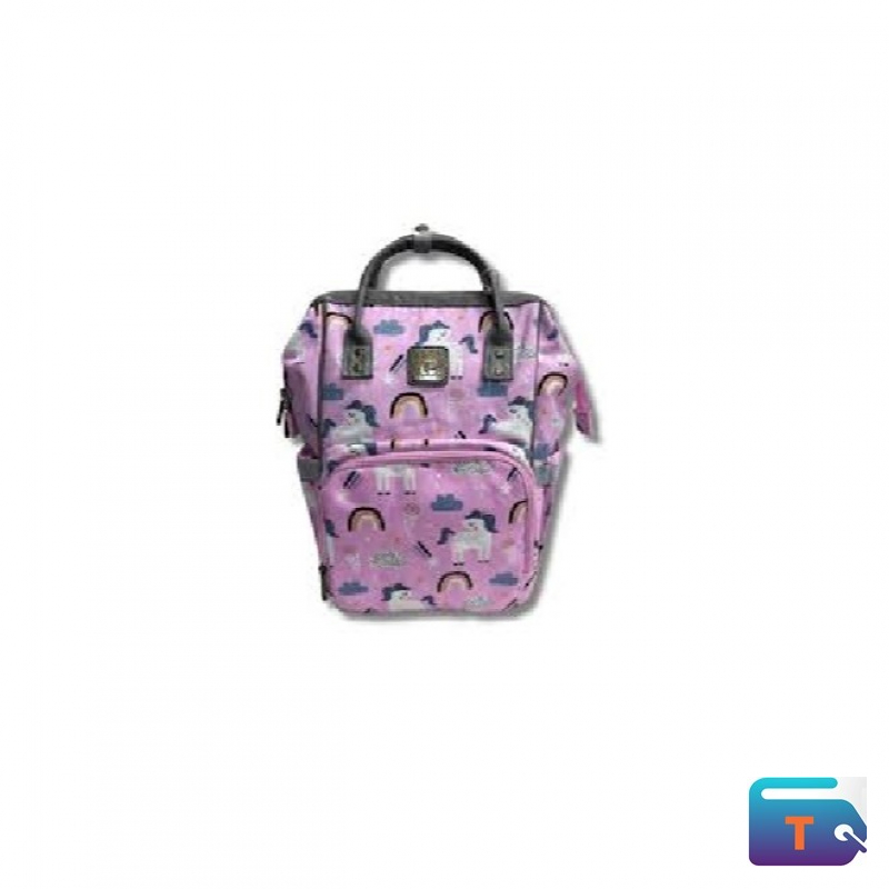 This is a Cotton Road Nappy Bag Backpack with a pink unicorn print. It is designed to be a versatile and spacious nappy bag suitable for traveling with a baby. The bag features a unicorn design with rainbows and a top handle.