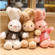 This is a plush toy in the shape of a white bunny with long, floppy ears and a pink nose. It is wearing a brown sweater or t-shirt with a small cartoon rabbit face printed on the front. Plush bunnies with clothing are made of soft fabrics like cotton or polyester and are intended as cuddly companions for children. The clothing is removable. It comes in other colors like blue, pink, beige.