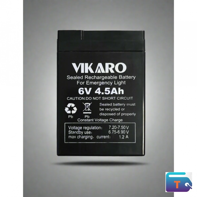 The VIKARO V-6V 4.5Ah battery is a sealed, rechargeable power source designed for emergency lamps and solar-powered systems. Built with reliability and safety in mind, it delivers consistent 6V output and long-lasting performance. Its sealed design ensures maintenance-free operation, while the compact form factor makes it ideal for backup lighting and low-voltage applications.