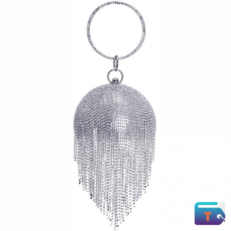 Design: fashionable round clutch is full of shining rhinestone, dazzling rhinestone tassels drooping naturally. A slim metal detachable chain for you make it can be used as many different styles, like a clutch, cross-boy bag, casual bags or shoulder bag. Come with a ring handle for an elegant tote bag.
