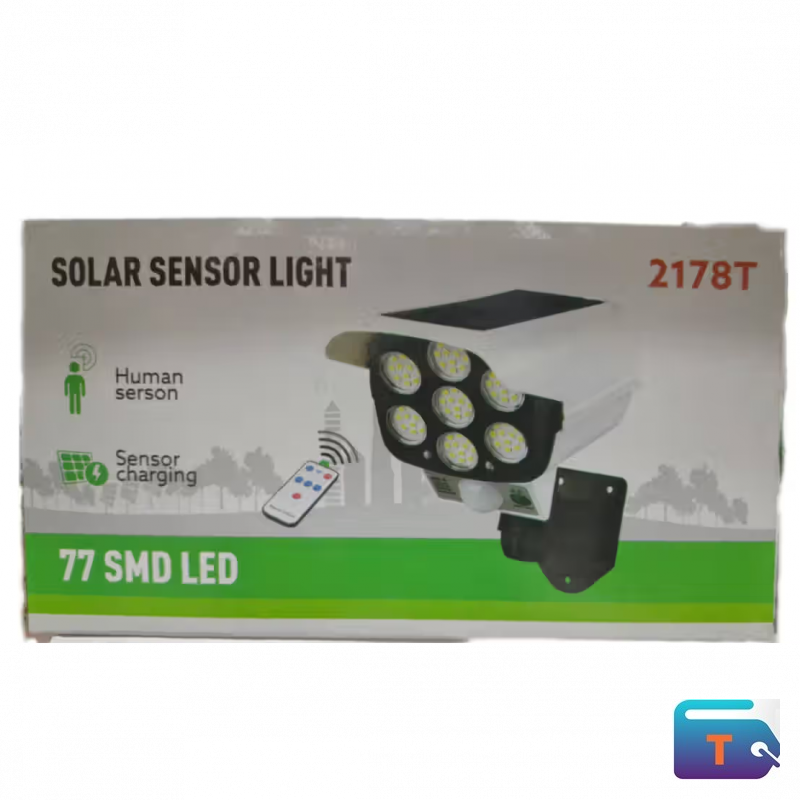 Illuminate outdoor spaces efficiently with the Solar Sensor Light 2178T. Featuring 77 high-intensity SMD LEDs, this unit provides powerful lighting triggered by motion detection. The integrated solar panel ensures eco-friendly charging, while the included remote control allows convenient operation and mode selection.