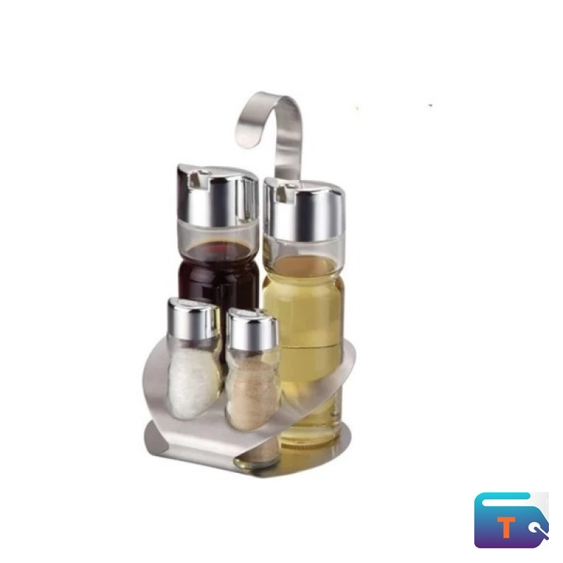Organize and serve your essential condiments in style with this 4-piece glass condiment set. Featuring two tall dispensers for oil and vinegar and two compact shakers for salt and pepper, all housed in a sleek metal stand with a carry handle—perfect for kitchen counters or dining tables.