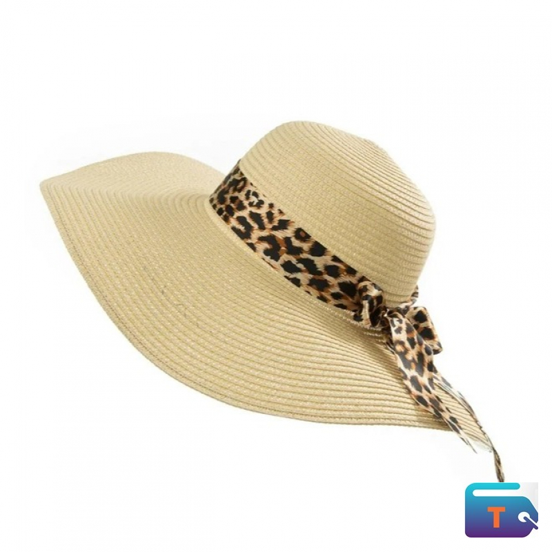 This is a wide-brimmed straw sun hat, often referred to as a floppy hat or beach hat. It is made from woven straw material and features a band with a leopard print design. The wide brim provides sun protection for the face and neck. It has a foldable and packable design, making them suitable for travel. The leopard print band can be a fixed ribbon or a removable scarf, and it sometimes includes a bow. This comes in different colors.