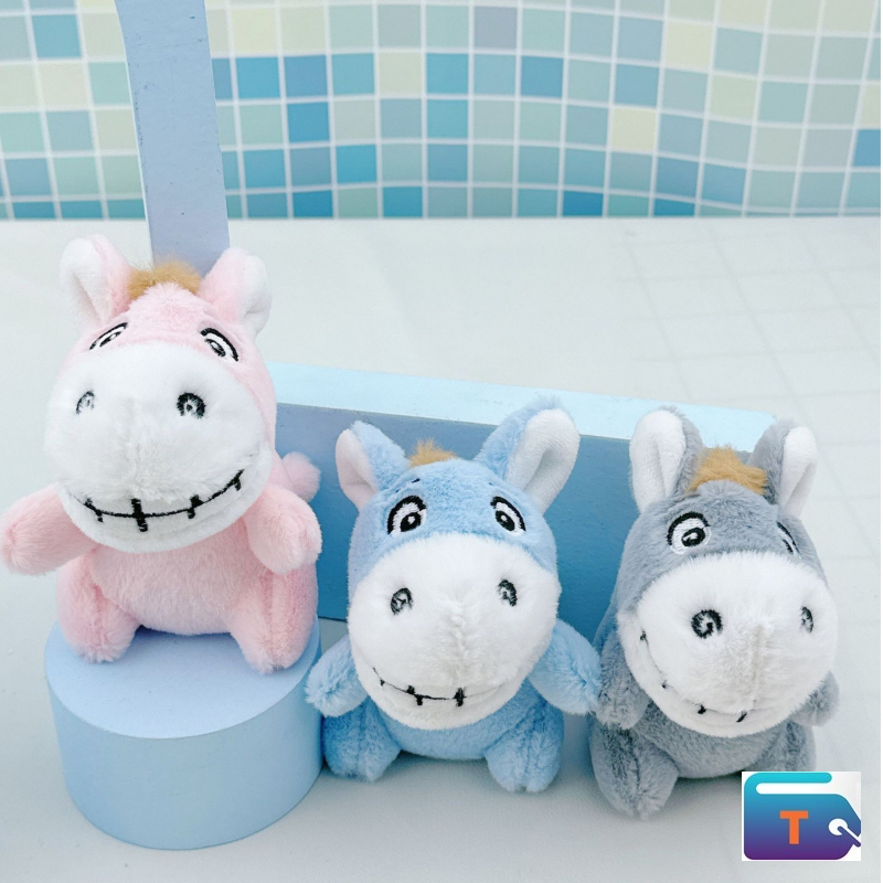 This is a plush toy resembling the character Donkey from the Shrek franchise. The stuffed animal is a light blue-gray color with a white snout and the inner parts of its ears are also white. It features a large, wide smile showing two rows of white teeth, and has black embroidered eyebrows and nostrils. This comes in different colors.