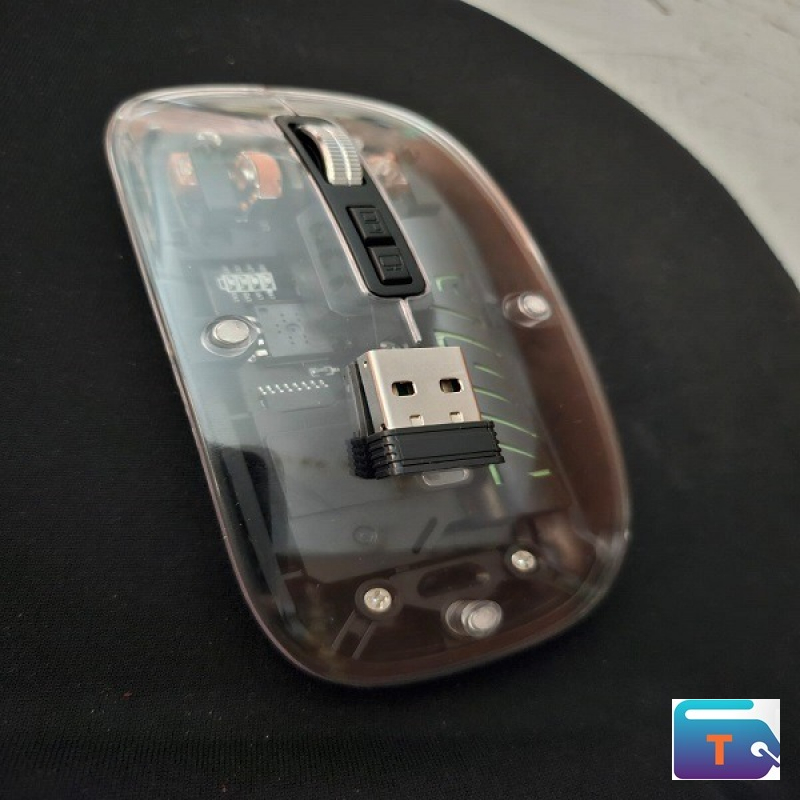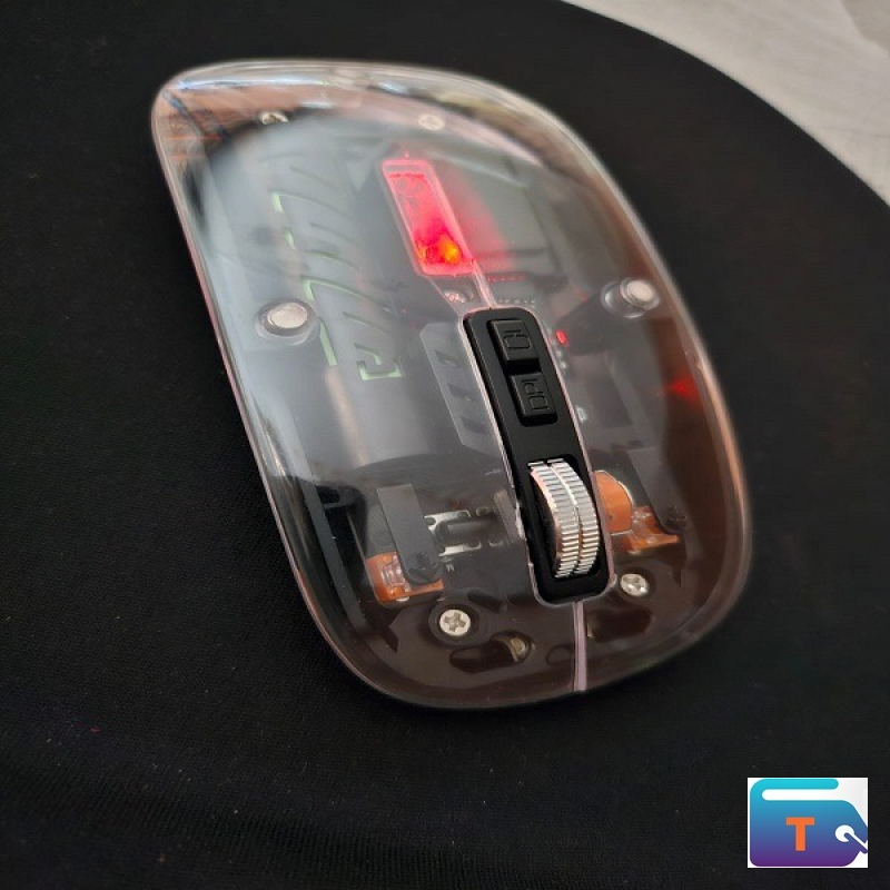 This is the Baihuo MY-7496 Wireless Mouse, featuring a transparent shell that exposes its internal components