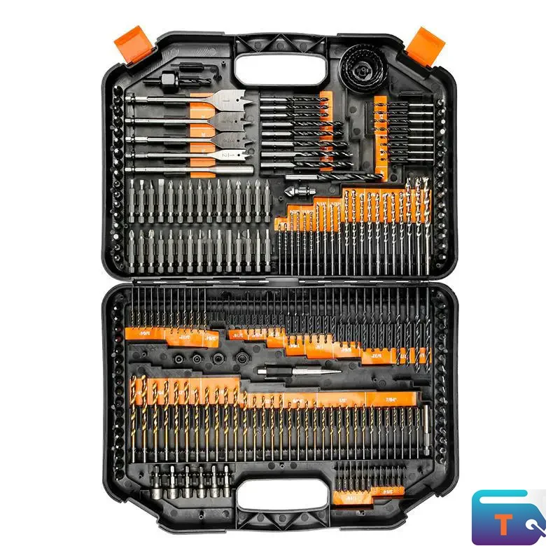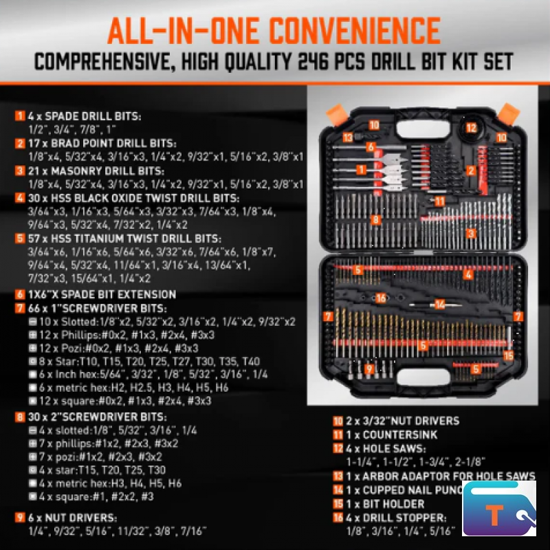 COMPREHENSIVE COLLECTION - Boasting 246 pieces, this drill bit set includes a variety of tools for drilling in wood, metal, and cement. The set is ideal for both professionals and DIY enthusiasts.