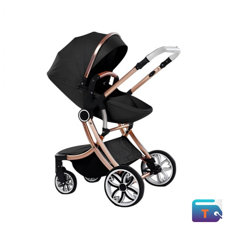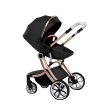 This is a 2-in-1 luxury baby pram or stroller, often called an "Egg Stroller" due to the shape of the bassinet and seat unit. This model has a black fabric seat and a rose gold-colored aluminum alloy frame. The seat can  be adjusted to multiple positions, including sitting, reclining, and sleeping, and may be reversible to allow the baby to face forward or toward the parent.