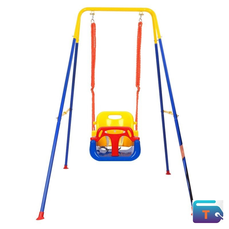 This is a 3-in-1 toddler swing set with a metal A-frame stand. The swing is designed for both indoor and outdoor use.