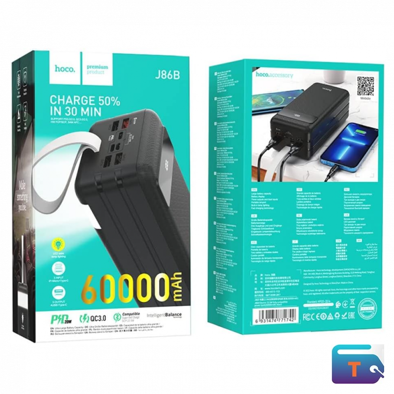 The HOCO 60000mAh Power Bank is a powerhouse for mobile charging, designed to keep your devices powered for days. With support for multiple fast-charging protocols and a rugged, portable design, it’s ideal for travel, outdoor use, and heavy-duty charging needs.