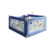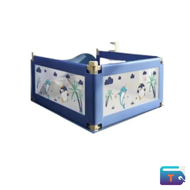 This product is a baby safety bed rail. It is designed to be installed around a bed to prevent a baby or toddler from accidentally falling out. This particular bed rail is blue and features cartoon animal designs, including penguins and dolphins, as well as palm trees. The rail is  made with a steel frame and breathable mesh fabric, which is abrasion-resistant and easy to clean. Some models are adjustable in height and can be folded down for easier access to the bed. It is a three-sided enclosure for a standard bed.