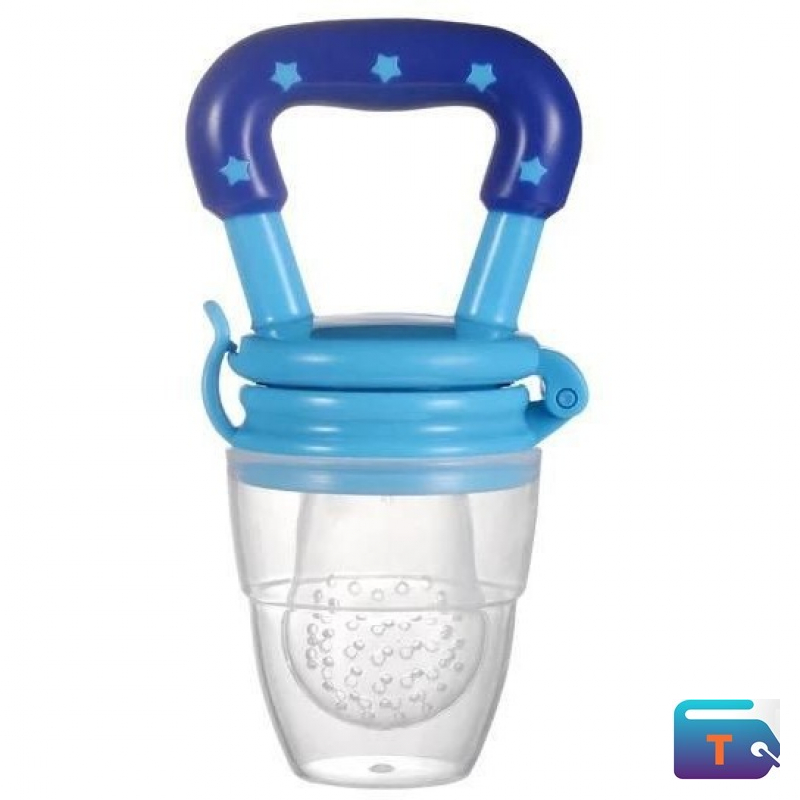 Baby food/fruit squeeze pacifier in durable ABS plastic with a soft silicone feeder tip that lets infants safely sample mashed fruit, purees and soft solids while preventing choking.