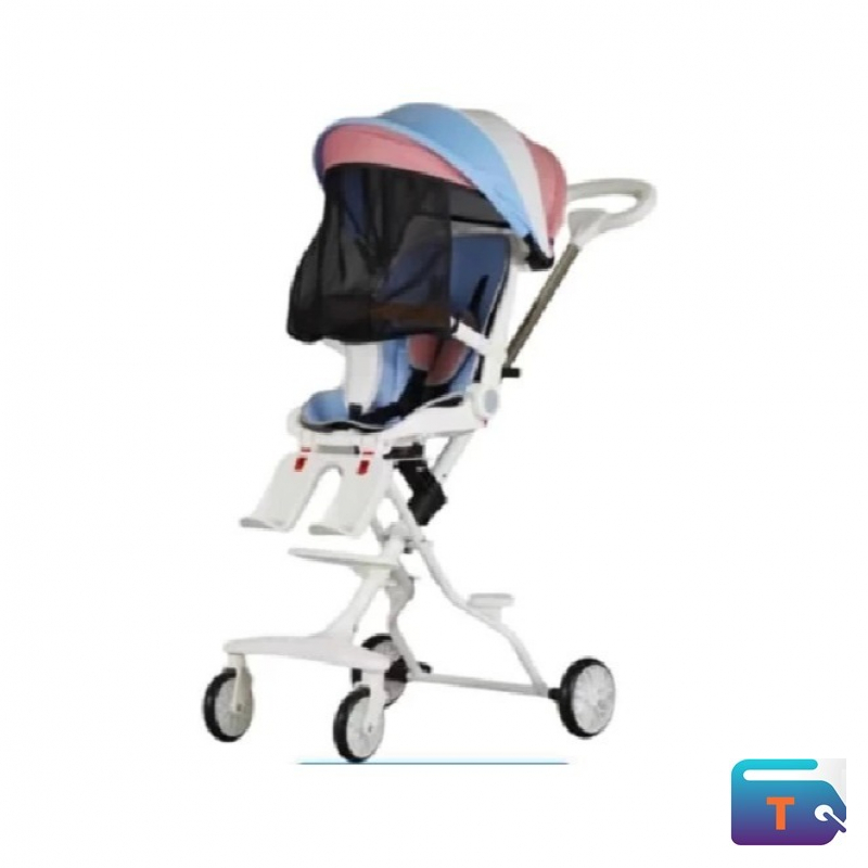 This is a baby stroller. It is designed with several features, including a "one-click rotation" and "fast folding" mechanism for easy use. The stroller has an enlarged seat, a double brake system, and a foldable footrest. This design also features a 360-degree rotational seat.