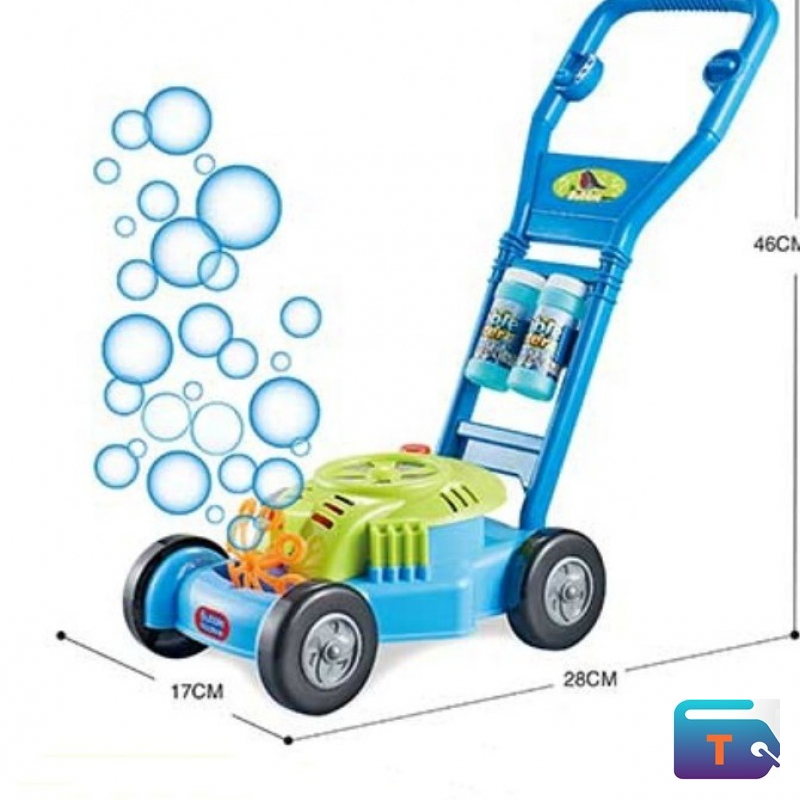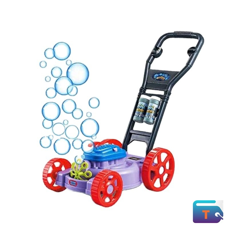 This is a bubble lawn mower toy for toddlers. It is a push-along toy designed to blow bubbles as a child pushes it, combining the fun of bubble-making with pretend gardening play. The toy includes a bubble solution and is made from plastic with a handle for a child to hold and push. This type of toy is intended to encourage physical activity, improve motor skills, and foster a sense of accomplishment in young children.