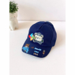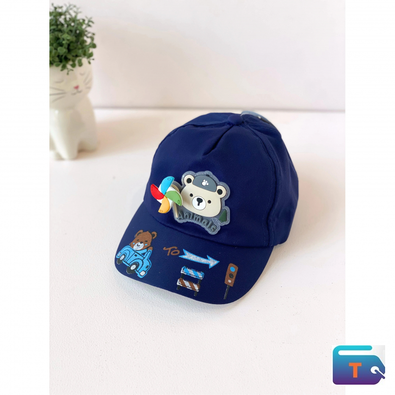 A navy blue children's baseball cap is decorated with a variety of cartoon-style patches and details. On the front, there is a large patch featuring a cartoon bear holding a multi-colored pinwheel with the word "Animals" printed below it. The brim of the cap has additional embroidered and appliqué elements, including a cartoon bear in a blue car, an arrow, traffic signs, and a traffic light. This comes in different colors.
