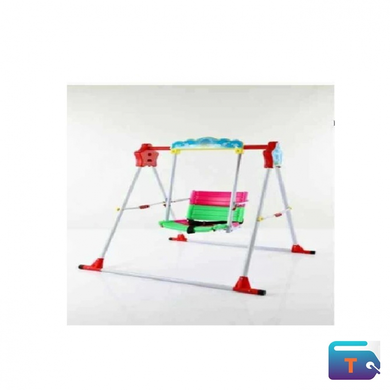 This is a children's swing set that can be used both indoors and outdoors. It is a steel and iron or metal and plastic swing chair for babies or toddlers. The swing features a colorful seat, in a combination of pink, green, and other bright colors. It is a 3in1 set with removable seat, suitable for different age ranges, and a safety harness. It is also lightweight and foldable for easy storage and portability. The product requires assembly.