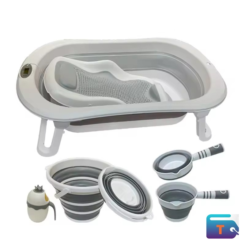 This is a collapsible baby bathtub set that is designed for convenience and space-saving storage. This type of tub is suitable for newborns to toddlers and often includes several accessories.