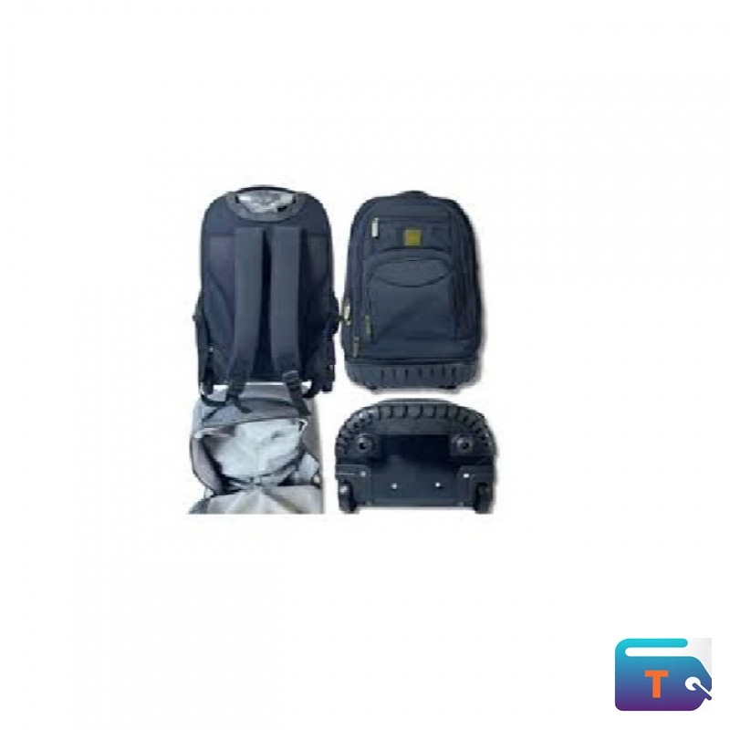 The bag is a Cotton Road Trolley Backpack designed to function as both a backpack and a rolling bag. It is black and features a sturdy hard base with wheels, as well as a retractable handle. The design includes padded, adjustable shoulder straps that can be tucked away when the bag is being wheeled.