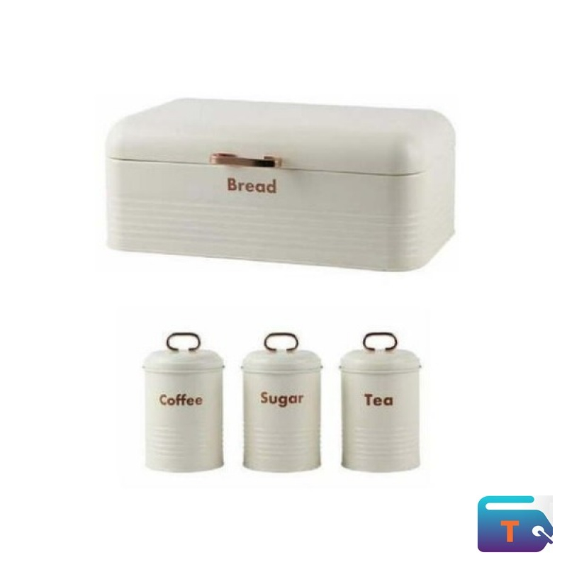 Upgrade your kitchen storage with this cream-colored canister set featuring bold brown labels and elegant copper handles. The set includes a spacious bread bin and three matching containers for Tea, Sugar, and Coffee. With its clean finish and coordinated design, this collection offers both style and practicality for modern and classic kitchens.