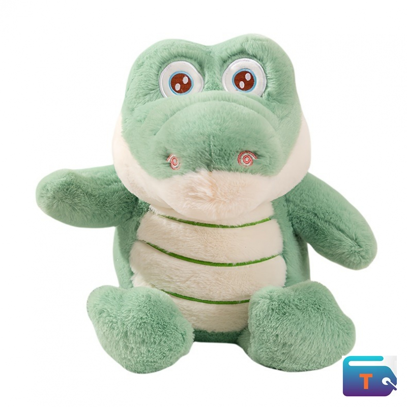 This is a soft stuffed animal with a green body, a white belly, and yellow accents. The toy has large, round eyes, a stitched smile, and a short snout. The plush is often described as being soft and cuddly, suitable for children.