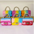 This is a quilted jelly crossbody bag with a tie-dye or rainbow color pattern. The bag is a mini size and features a gold-toned twist-lock closure on the front flap. It has two straps: a top handle made of faux pearls and a long, detachable metal chain strap, allowing it to be worn as a shoulder or crossbody bag. The material is PVC, and is durable, lightweight, waterproof, and easy to clean.