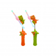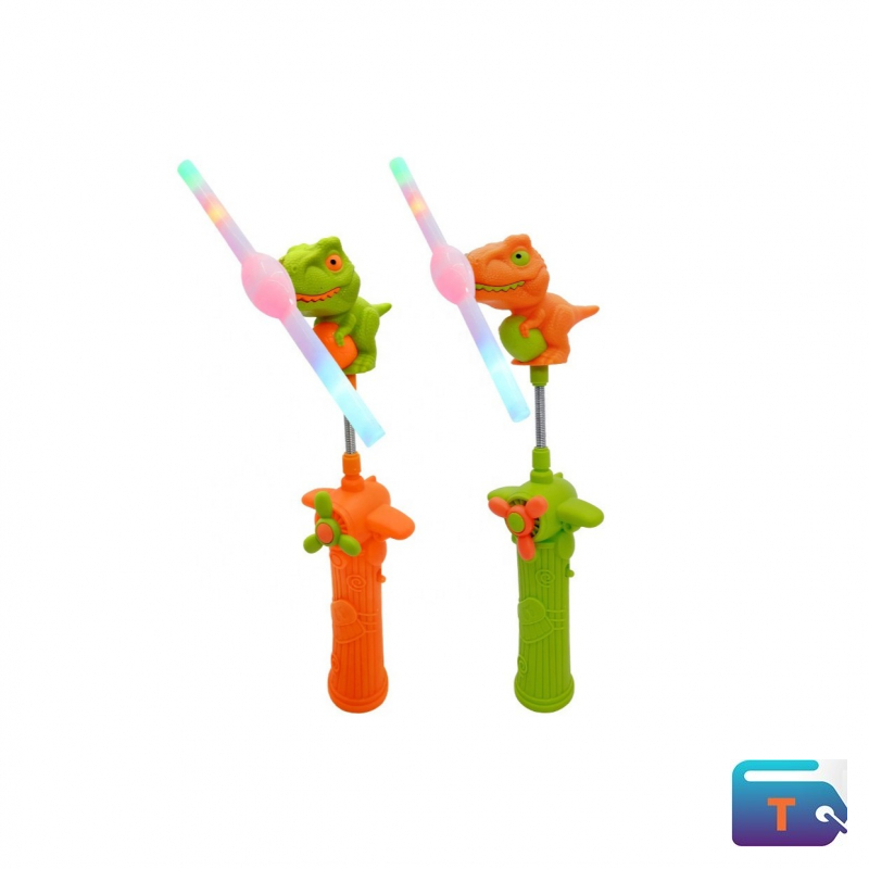 This is a dinosaur-themed toy wand with a spinning propeller, lights, and music. It is described as a "dinosaur flashing wand" or "light up dinosaur windmill". The toy has a handle and a dinosaur head at the top, which holds a propeller. The dinosaur's head and the propeller light up with a colorful LED light show when the toy is activated. It also plays music or has sound effects. The toy is battery-operated and is available in different colors.