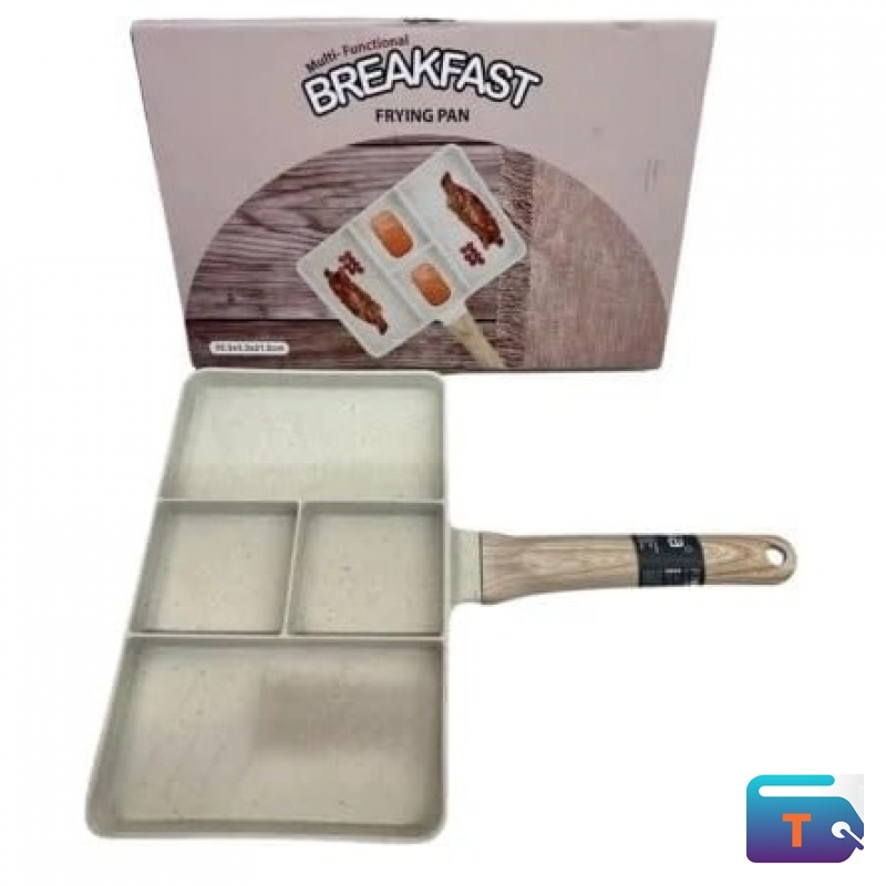 Simplify your morning cooking with this multi-functional breakfast frying pan featuring four separate compartments. Designed for efficiency, it allows you to prepare eggs, sausages, bacon, and pancakes simultaneously without mixing flavors. The beige speckled non-stick surface ensures easy food release and quick cleanup, while the wooden-textured handle provides a secure, heat-resistant grip. Perfect for busy households and creative breakfast plating.