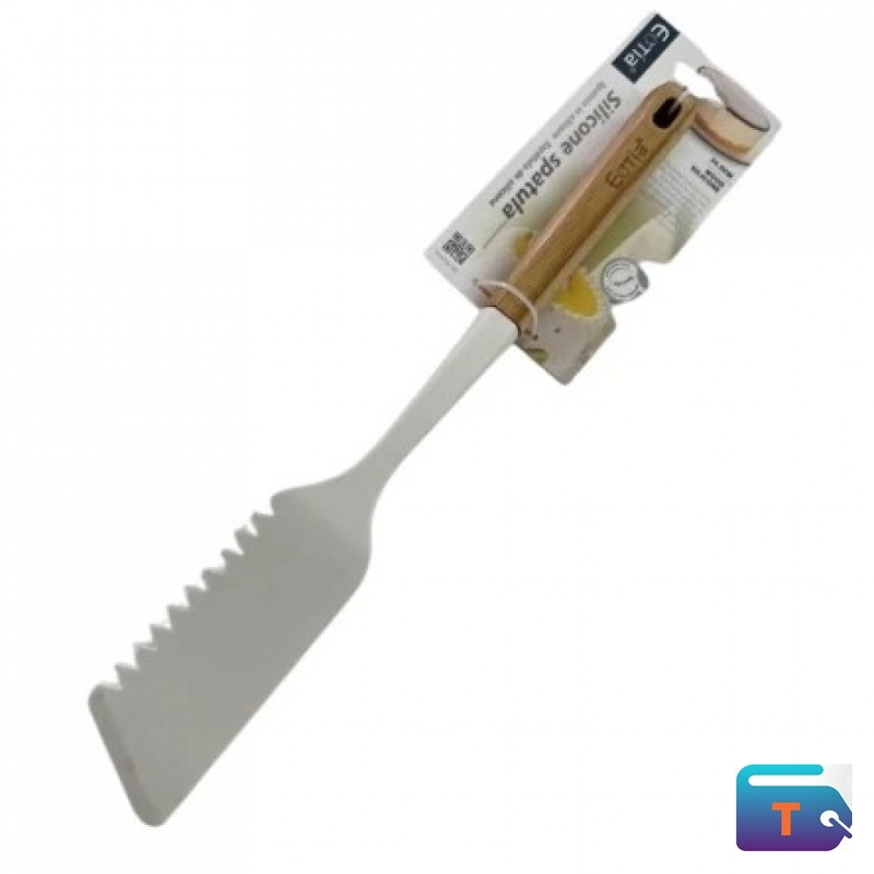 Mix, scrape, and spread with precision using this silicone spatula featuring a white head with a serrated edge for added versatility. The flexible silicone is safe for non-stick cookware and heat-resistant for high-temperature tasks. Paired with a smooth wooden handle, it offers a comfortable grip and stylish finish. Ideal for baking, cooking, and food prep.