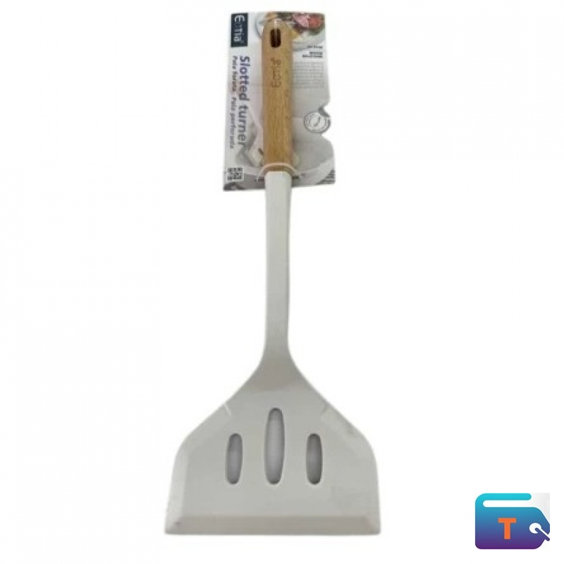 Flip, lift, and serve with precision using this slotted turner, designed for everyday cooking tasks. The white head features elongated slots for effective drainage, making it ideal for frying, sautéing, and serving. Paired with a smooth wooden handle, it offers a comfortable grip and a clean, modern look. A reliable tool for non-stick cookware and high-heat applications.