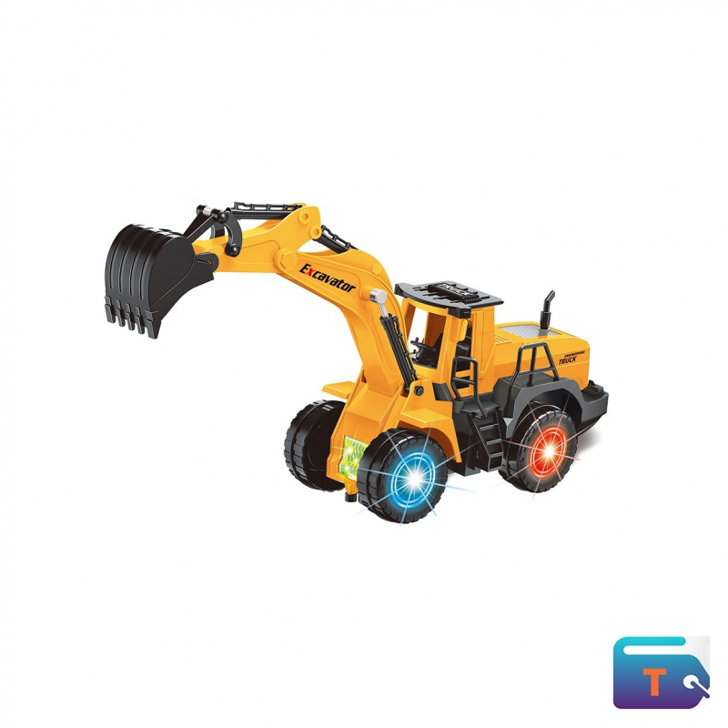 This is a yellow toy excavator truck that is part of a "Truck Engineering Series". It is described as a construction vehicle toy with lights and music effects. The toy is battery-operated and features a moveable excavator arm. It has dimensions of 14.9 cm in height and 10.5 cm in depth. The toy is for children age range of 2 to 7 years old.