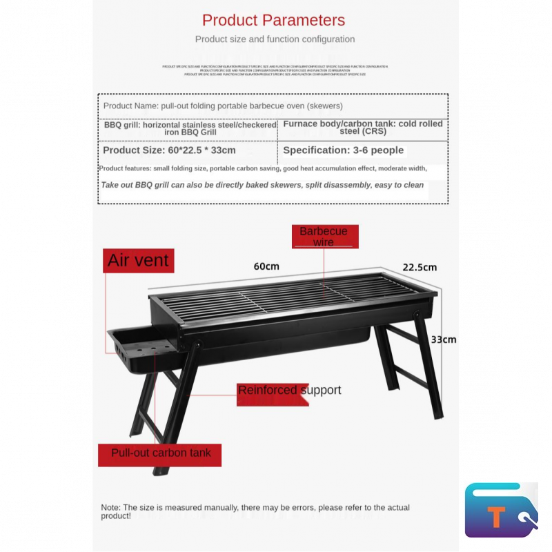 Lightweight & Portable- Camping BBQ Grill is lightweight and portable, only 2.8 Kg, folded and packed in box, and the BBQ grill opened size is 60cm22cm32cm, big space for use but small package is easy carry & storage. Not screws needed and easy to set up, removable grill and mess-free ash catcher for easy clean-up.