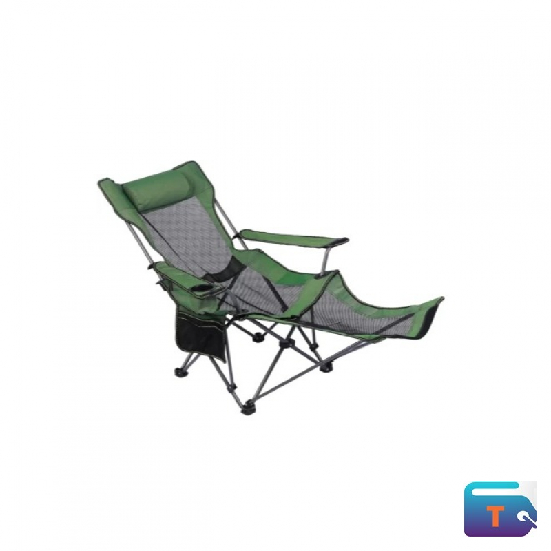 This is a portable, folding, reclining camping chair with a footrest, designed for outdoor leisure.