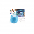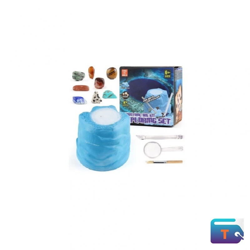 This is designed to provide an interactive and educational activity for kids aged 6 and up, allowing them to feel like a real geologist or archaeologist. It includes a blue "dig brick" or plaster block that contains hidden gemstones. To excavate the stones, the kit provides special tools: a chisel, a brush, and a magnifying glass. Digging can be made easier by soaking the block in water.