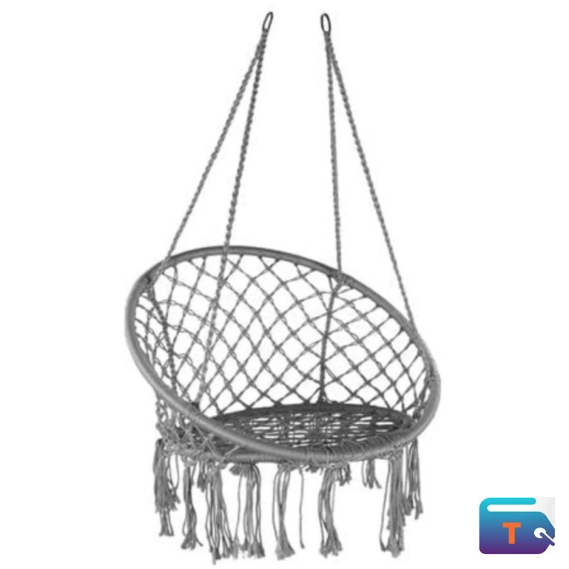 This  is a grey macrame hanging chair, often referred to as a hammock chair or swing chair. It features a distinctive bohemian style that can be used both indoors and outdoors.