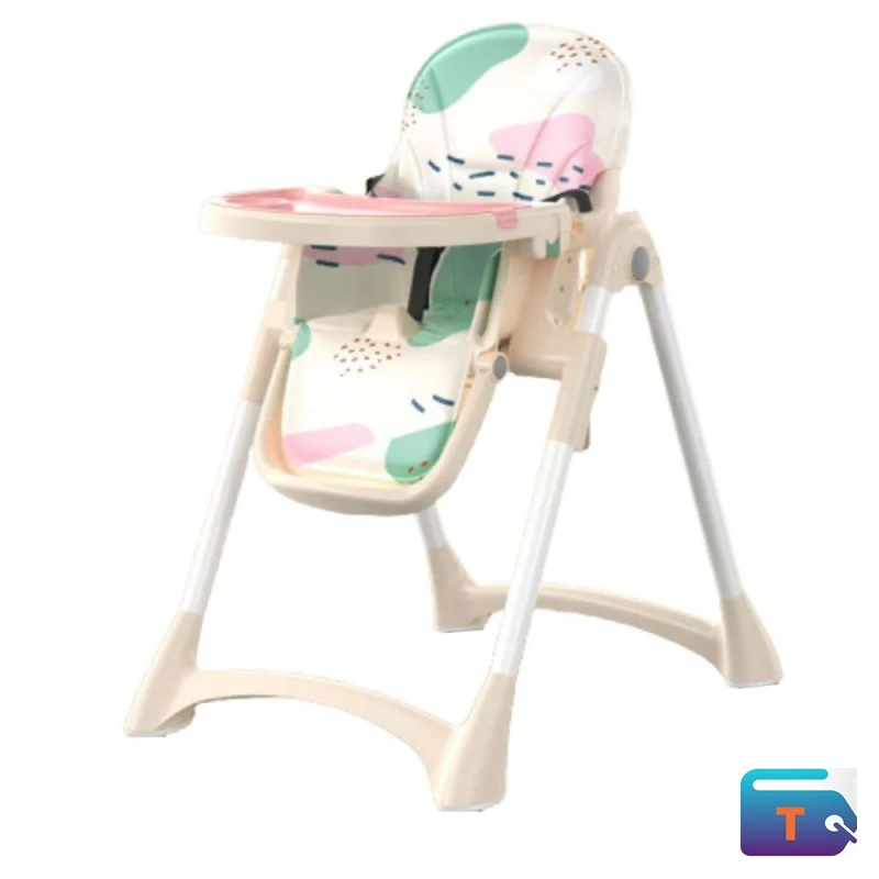This baby high chair is beige with a removable, light pink feeding tray. The seat cushion features a modern, abstract pattern with pastel colors including teal, pink, and black dashes on a light background. It has an adjustable footrest and a small, white mesh storage basket located underneath the seat. The chair is designed to be functional with a sturdy frame, and many similar models are known to be height-adjustable, easy to clean, and foldable for storage