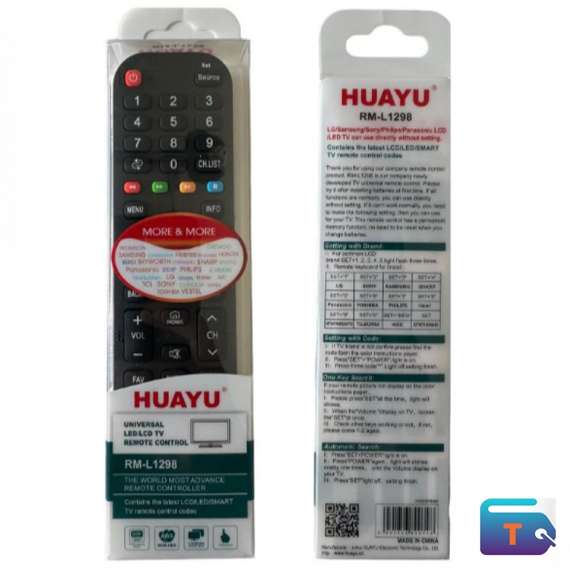 The HUAYU RM-L1298 Universal LED/LCD TV Remote Control is marketed as "THE WORLD MOST ADVANCE REMOTE CONTROLLER" and is equipped with the latest LCD/LED/Smart TV remote control codes. This remote offers exceptional out-of-the-box compatibility, allowing for direct, no-setup control for major brands including LG, Samsung, Sony, Philips, and Panasonic LCD/LED TVs. For other brands, the RM-L1298 offers highly flexible programming options, including a one-key Setting with Brand quick setup method, manual Setting with Code entry, and a convenient One Key Search function for automatic setup. Key features include a full numerical keypad, dedicated buttons for Source, CH. LIST, and essential navigation controls like Menu, Back, Home, and media playback functions. The remote is designed to simplify control and eliminate the need for multiple remote devices.