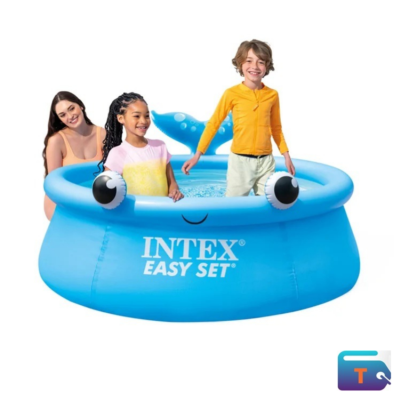 Intex Easy Set Jolly Whale Inflatable Pool is a round, above-ground pool designed for children aged 3 and up. It features a blue whale design with inflatable eyes and a tail. The pool is made from a puncture-resistant, three-ply PVC material.